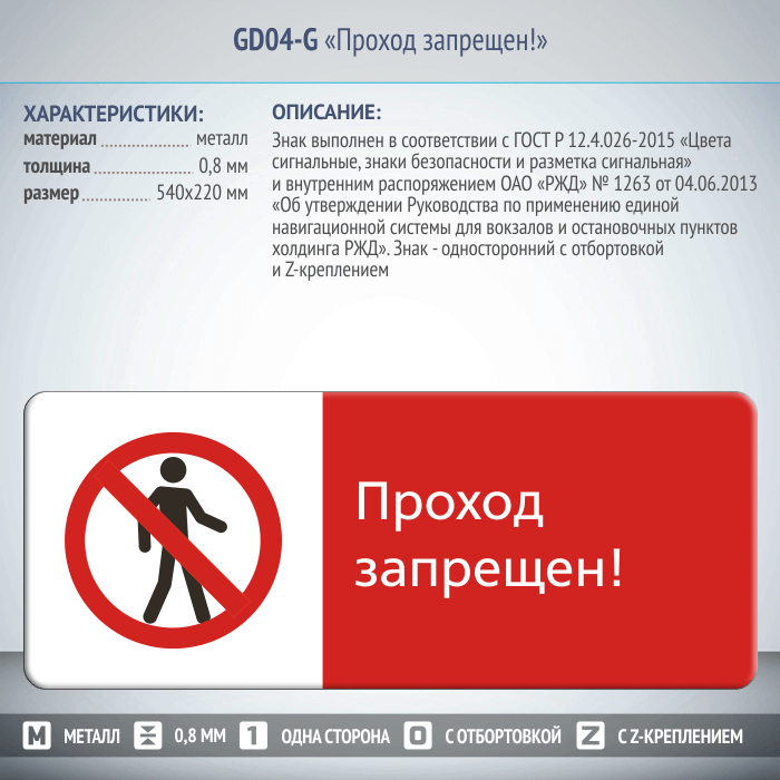 Знак «Проход запрещен!», GD04-G (односторонний горизонтальный, 540х220 мм, металл, с отбортовкой и Z-креплением) в Твери купить