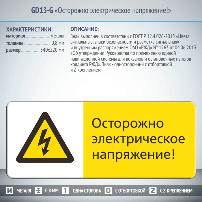 Знак «Осторожно электрическое напряжение!», GD13-G (односторонний горизонтальный, 540х220 мм, металл, с отбортовкой и Z-креплением) в Твери купить