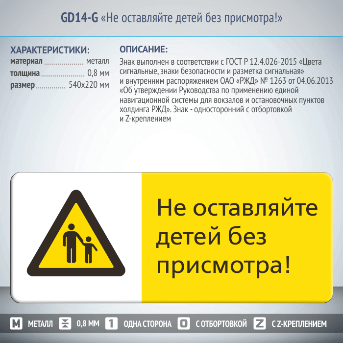 Знак «Не оставляйте детей без присмотра!», GD14-G (односторонний горизонтальный, 540х220 мм, металл, с отбортовкой и Z-креплением) в Твери купить