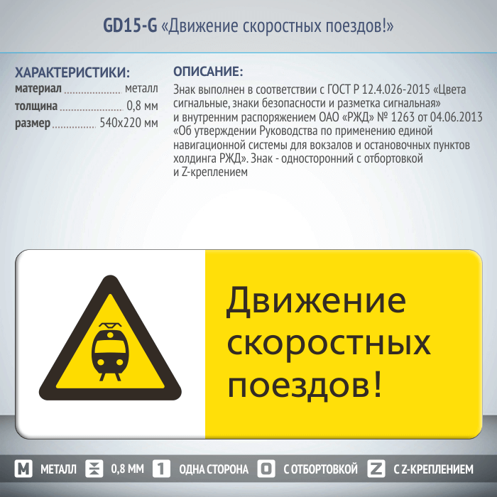 Знак «Движение скоростных поездов!», GD15-G (односторонний горизонтальный, 540х220 мм, металл, с отбортовкой и Z-креплением) в Твери купить