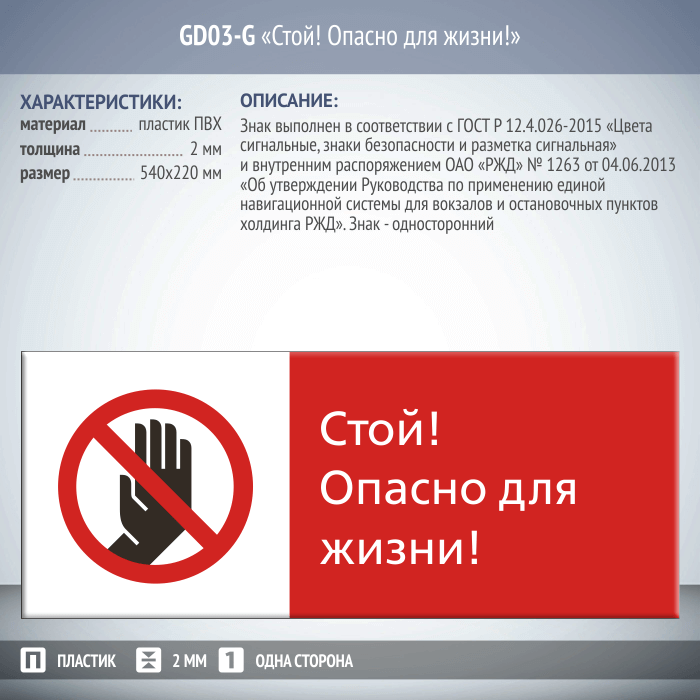 Знак «Стой! Опасно для жизни!», GD03-G (односторонний горизонтальный, 540х220 мм, пластик 2 мм) в Твери купить