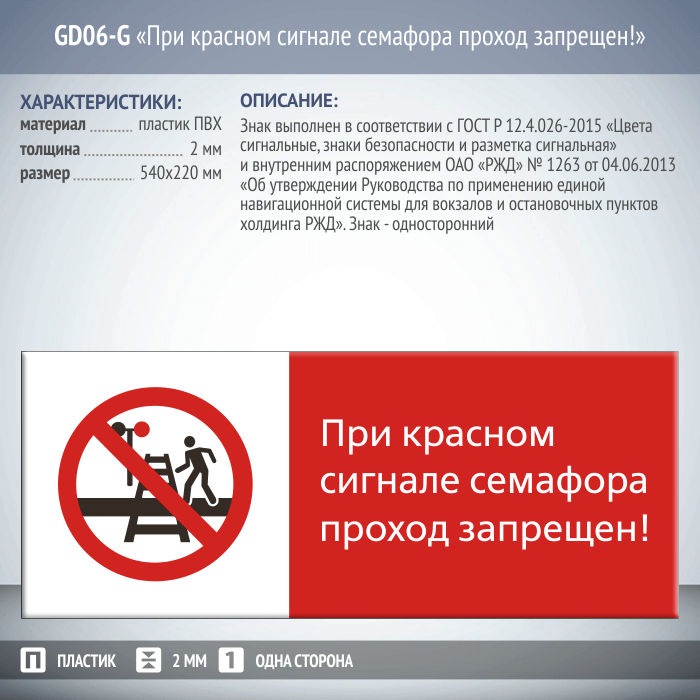 Знак «При красном сигнале семафора проход запрещен!», GD06-G (односторонний горизонтальный, 540х220 мм, пластик 2 мм) в Твери купить