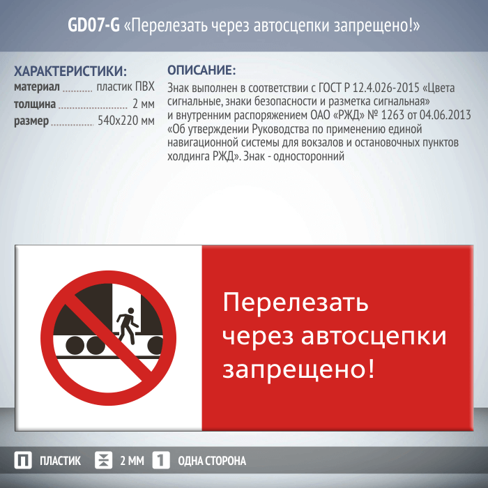 Знак «Перелезать через автосцепки запрещено!», GD07-G (односторонний горизонтальный, 540х220 мм, пластик 2 мм) в Твери купить