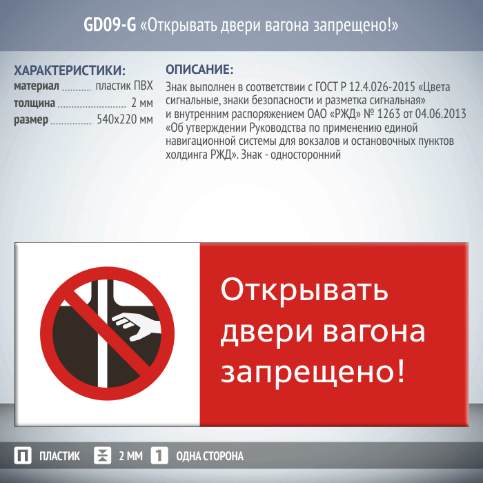 Знак «Открывать двери вагона запрещено!», GD09-G (односторонний горизонтальный, 540х220 мм, пластик 2 мм) в Твери купить