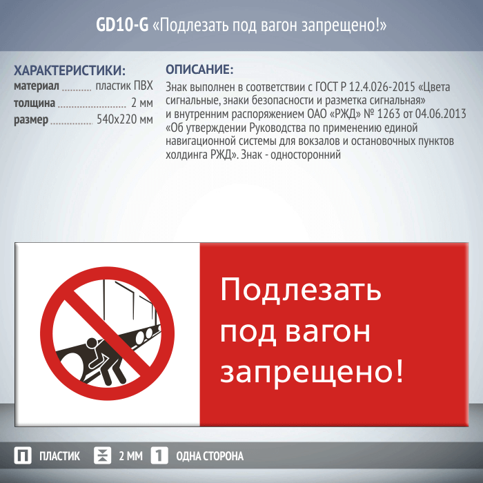 Знак «Подлезать под вагон запрещено!», GD10-G (односторонний горизонтальный, 540х220 мм, пластик 2 мм) в Твери купить