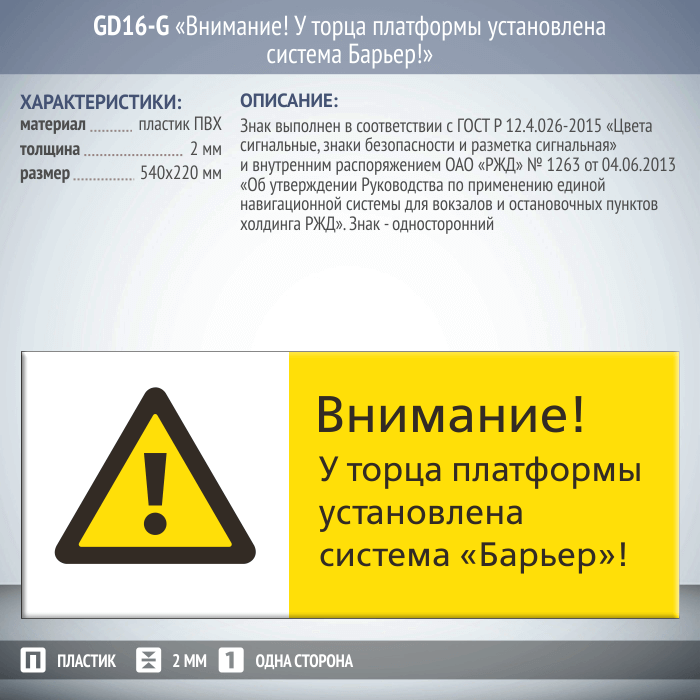 Знак «Внимание! У торца платформы установлена система Барьер!», GD16-G (односторонний горизонтальный, 540х220 мм, пластик 2 мм) в Твери купить