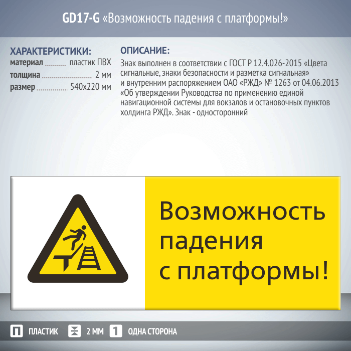 Знак «Возможность падения с платформы!», GD17-G (односторонний горизонтальный, 540х220 мм, пластик 2 мм) в Твери купить