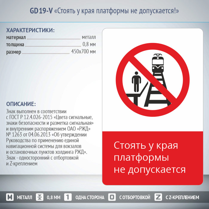 Знак «Стоять у края платформы не допускается!», GD19-V (односторонний вертикальный, 450х700 мм, металл, с отбортовкой и Z-креплением) в Твери купить