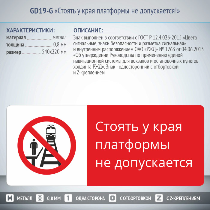 Знак «Стоять у края платформы не допускается!», GD19-G (односторонний горизонтальный, 540х220 мм, металл, с отбортовкой и Z-креплением) в Твери купить