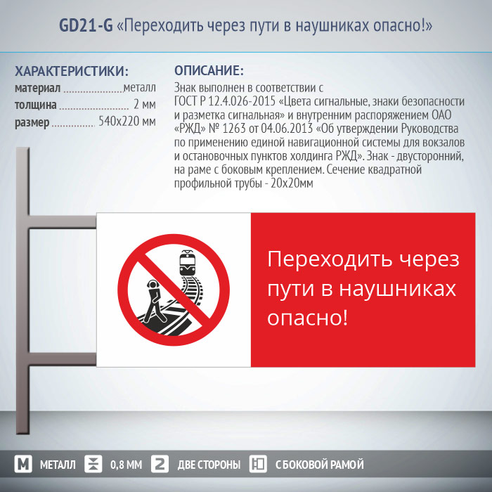 Знак «Переходить через пути в наушниках опасно!», GD21-G (двусторонний горизонтальный, 540х220 мм, металл, на раме с боковым креплением) в Твери купить