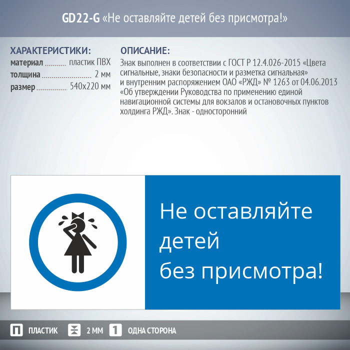 Знак «Не оставляйте детей без присмотра!», GD22-G (односторонний горизонтальный, 540х220 мм, пластик 2 мм) в Твери купить