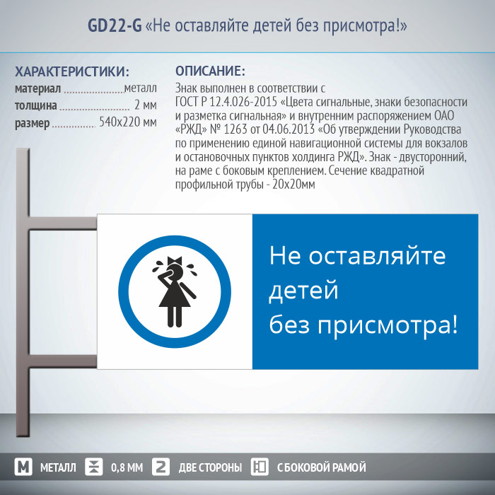 Знак «Не оставляйте детей без присмотра!», GD22-G (двусторонний горизонтальный, 540х220 мм, металл, на раме с боковым креплением) в Твери купить