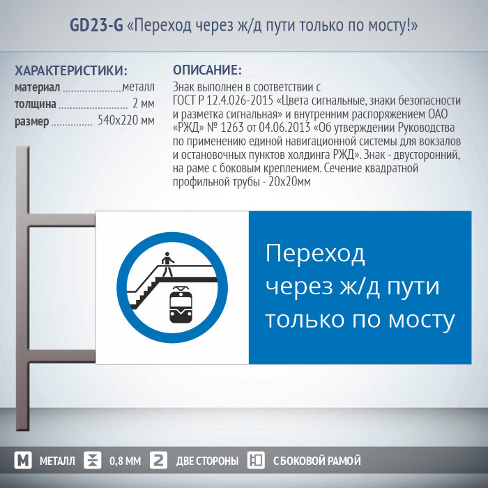 Знак «Переход через ж/д пути только по мосту!», GD23-G (двусторонний горизонтальный, 540х220 мм, металл, на раме с боковым креплением) в Твери купить