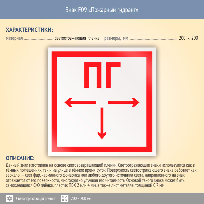 Знак F09 «Пожарный гидрант» (светоотражающая пленка, 200х200 мм) в Твери купить
