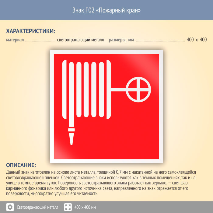 Знак F02 «Пожарный кран» (светоотражающий металл, 400х400 мм) в Твери купить