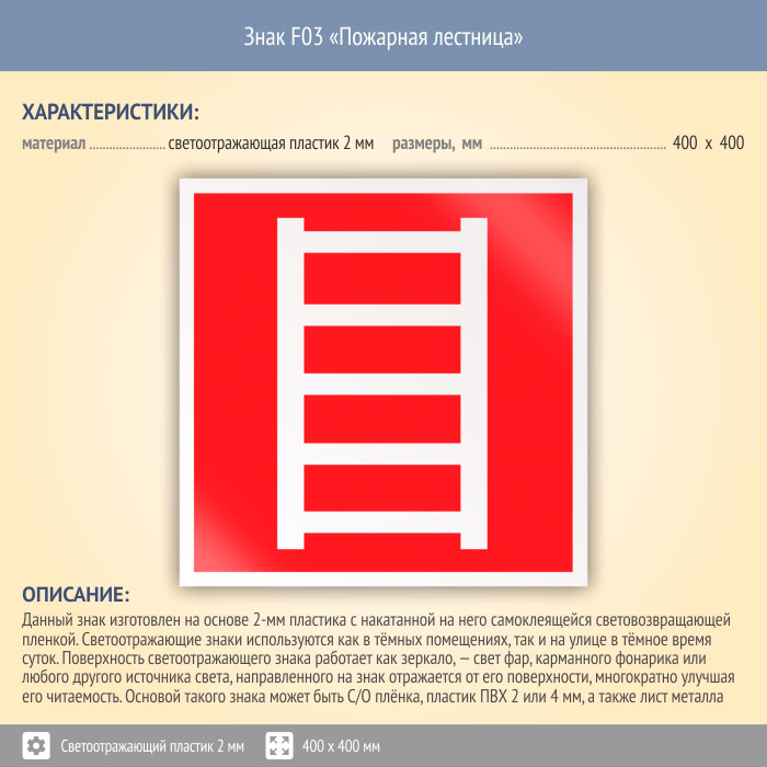 Знак F03 «Пожарная лестница» (светоотражающий пластик, 400х400 мм) в Твери купить