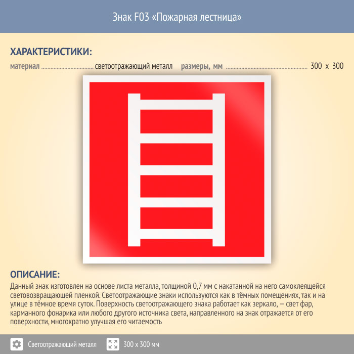 Знак F03 «Пожарная лестница» (светоотражающий металл, 300х300 мм) в Твери купить