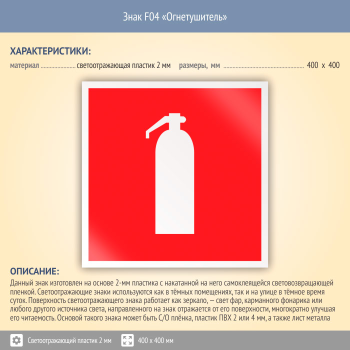 Знак F04 «Огнетушитель» (светоотражающий пластик, 400х400 мм) в Твери купить