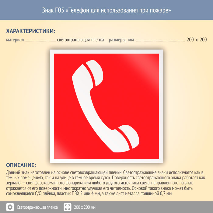 Знак F05 «Телефон для использования при пожаре (в том числе телефон прямой связи с пожарной охраной)» (светоотражающая пленка, 200х200 мм) в Твери купить