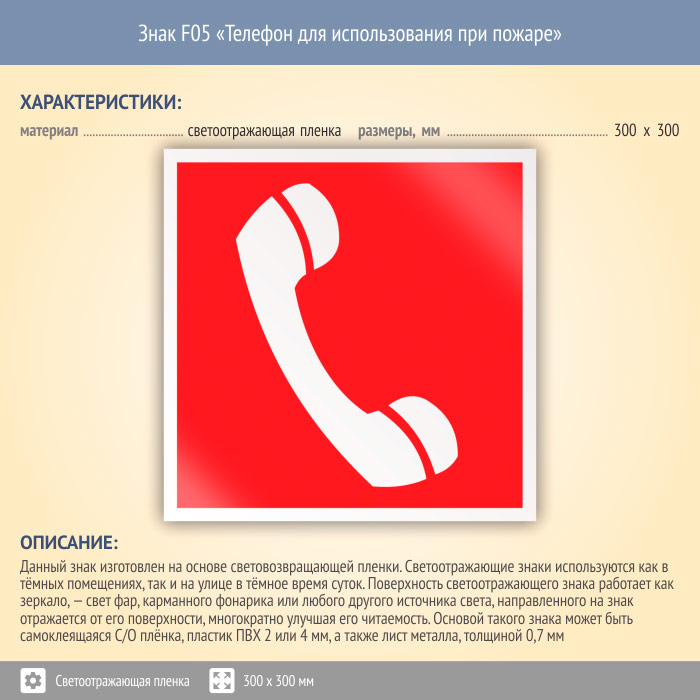 Знак F05 «Телефон для использования при пожаре (в том числе телефон прямой связи с пожарной охраной)» (светоотражающая пленка, 300х300 мм) в Твери купить