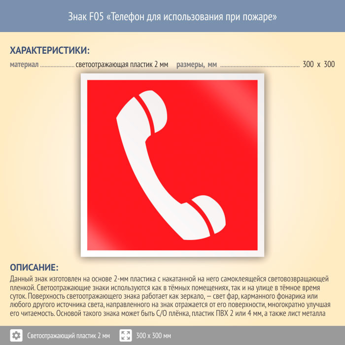 Знак F05 «Телефон для использования при пожаре (в том числе телефон прямой связи с пожарной охраной)» (светоотражающий пластик, 300х300 мм) в Твери купить