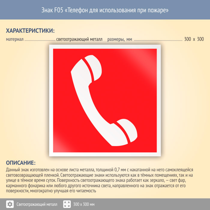 Знак F05 «Телефон для использования при пожаре (в том числе телефон прямой связи с пожарной охраной)» (светоотражающий металл, 300х300 мм) в Твери купить
