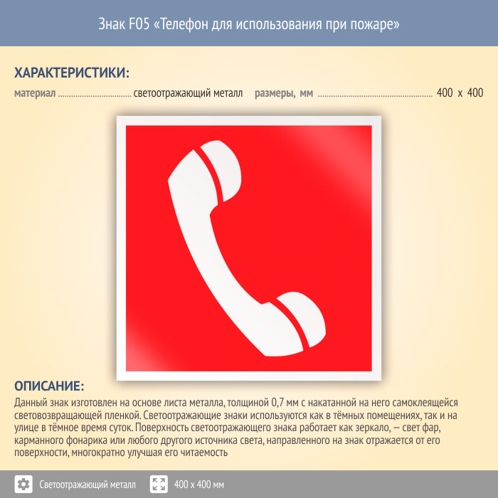Знак F05 «Телефон для использования при пожаре (в том числе телефон прямой связи с пожарной охраной)» (светоотражающий металл, 400х400 мм) в Твери купить