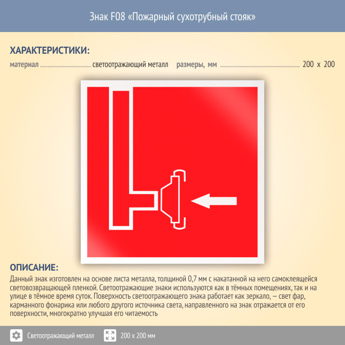 Знак F08 «Пожарный сухотрубный стояк» (светоотражающий металл, 200х200 мм) в Твери купить