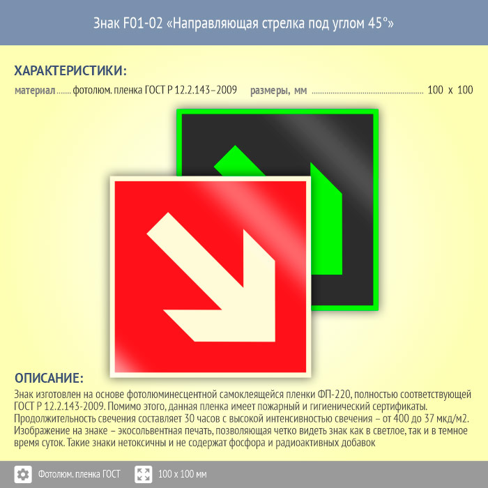 Знак F01-02 «Направляющая стрелка под углом 45°» (фотолюминесцентная пленка ГОСТ 34428-2018, 100х100 мм) в Твери купить