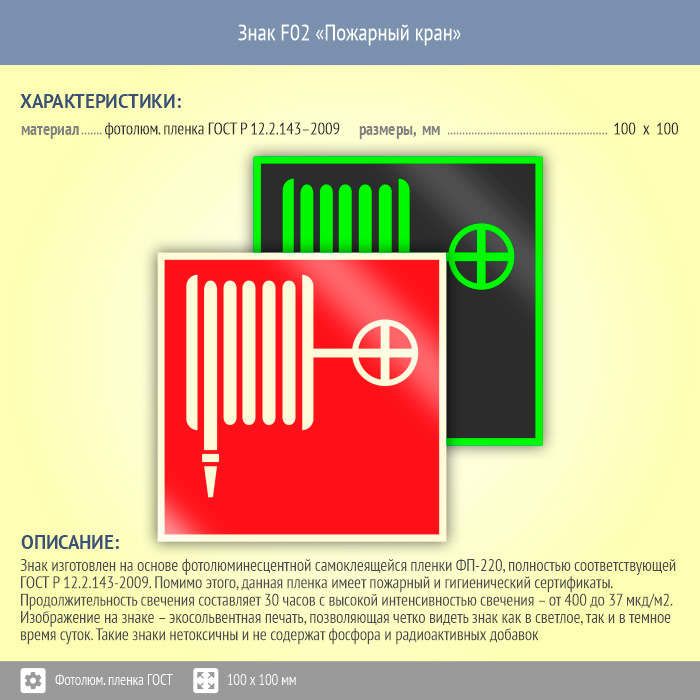 Знак F02 «Пожарный кран» (фотолюминесцентная пленка ГОСТ 34428-2018, 100х100 мм) в Твери купить