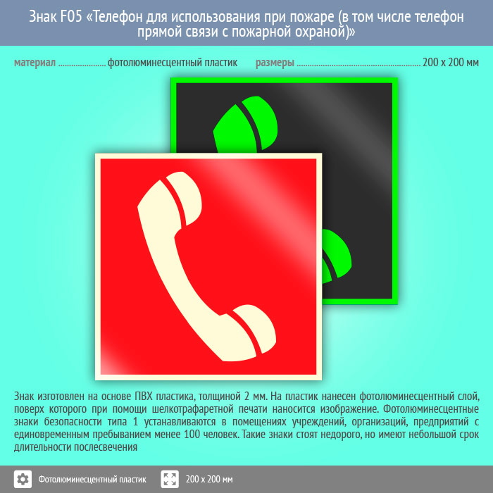 Знак F05 «Телефон для использования при пожаре (в том числе телефон прямой связи с пожарной охраной)» (фотолюминесцентный пластик, 200х200 мм) в Твери купить