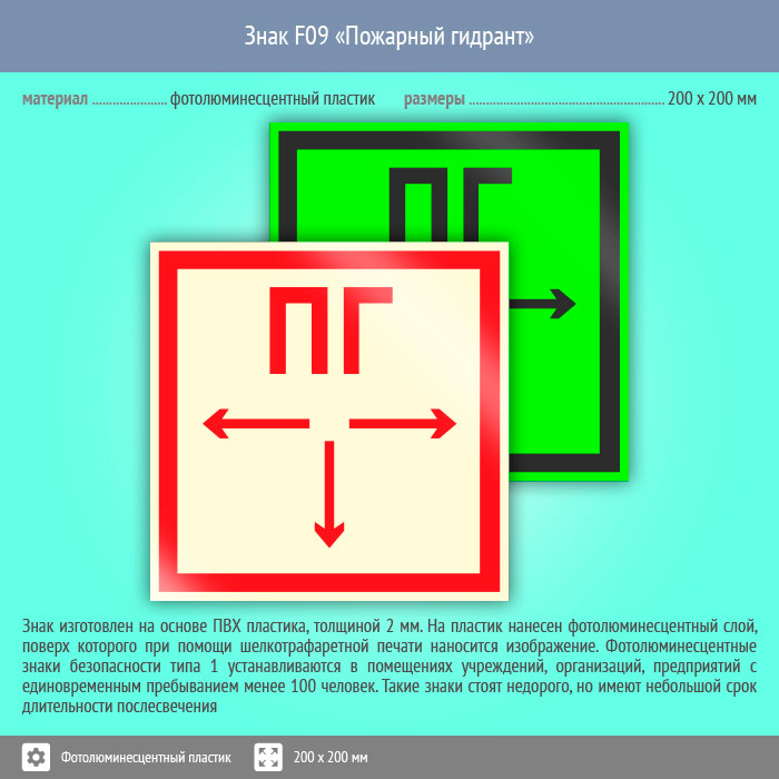Знак F09 «Пожарный гидрант» (фотолюминесцентный пластик, 200х200 мм) в Твери купить