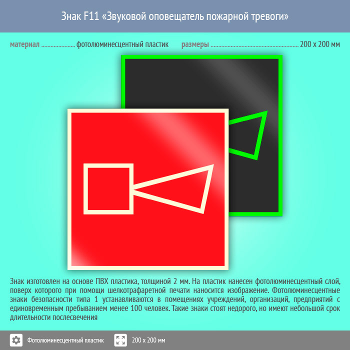 Знак F11 «Звуковой оповещатель пожарной тревоги» (фотолюминесцентный пластик, 200х200 мм) в Твери купить