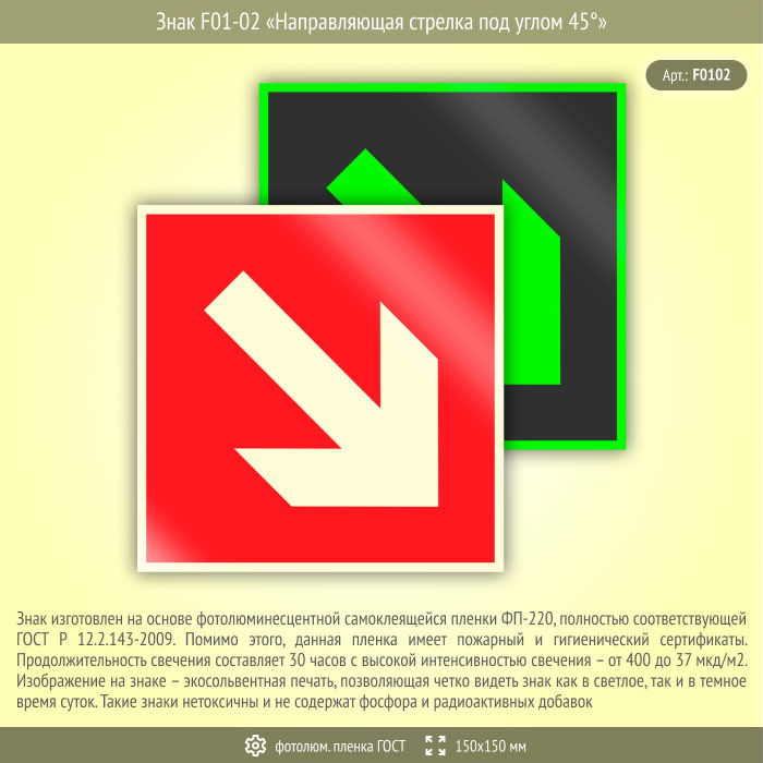 Знак F01-02 «Направляющая стрелка под углом 45°» (фотолюминесцентная пленка ГОСТ 34428-2018, 150х150 мм) в Твери купить