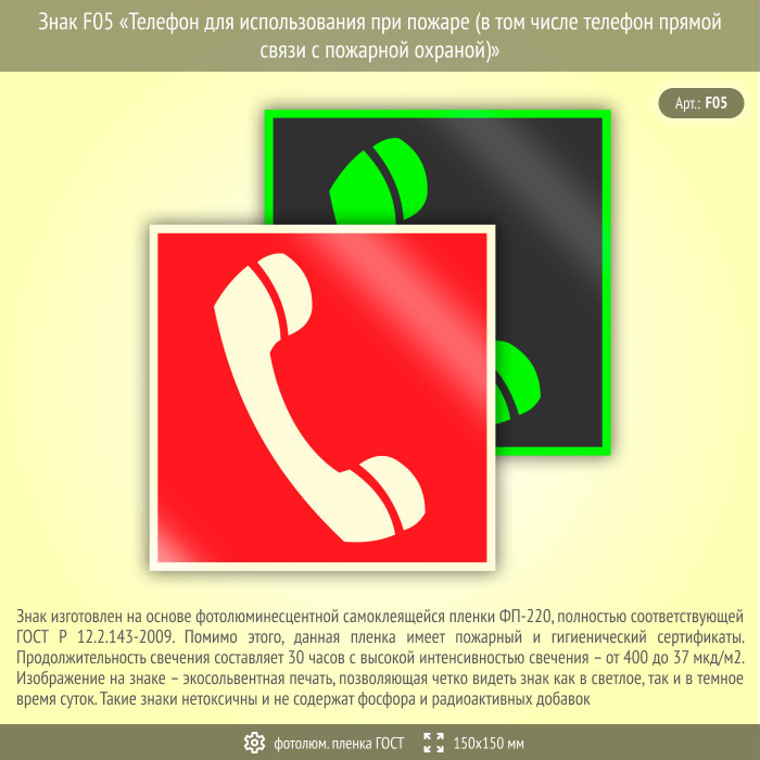 Знак F05 «Телефон для использования при пожаре (в том числе телефон прямой связи с пожарной охраной)» (фотолюминесцентная пленка ГОСТ 34428-2018, 150х150 мм) в Твери купить