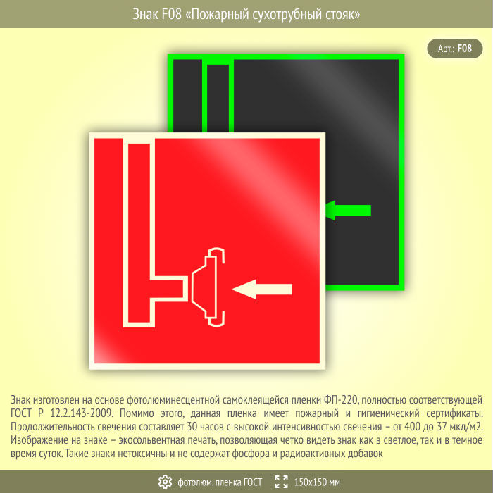 Знак F08 «Пожарный сухотрубный стояк» (фотолюминесцентная пленка ГОСТ 34428-2018, 150х150 мм) в Твери купить