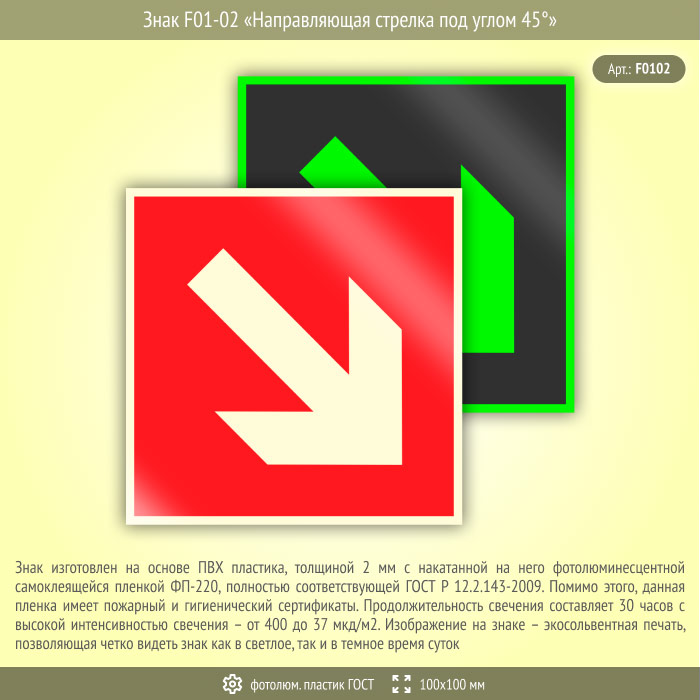 Знак F01-02 «Направляющая стрелка под углом 45°» (фотолюминесцентный пластик ГОСТ 34428-2018, 100х100 мм) в Твери купить