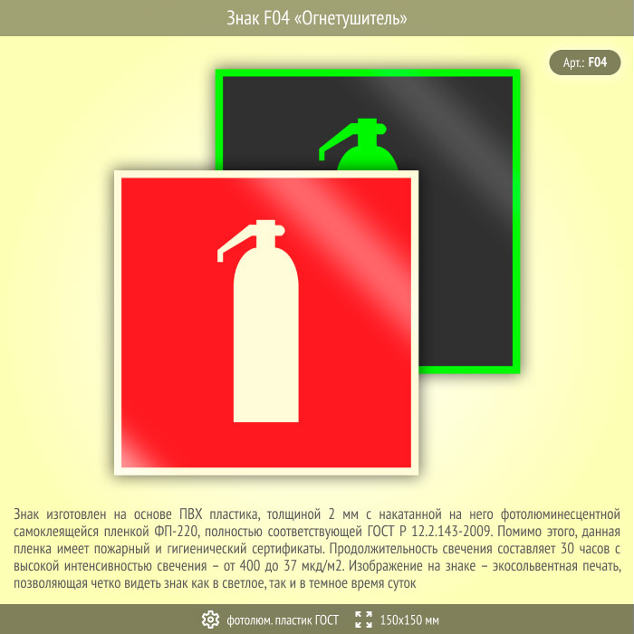 Знак F04 «Огнетушитель» (фотолюминесцентный пластик ГОСТ 34428-2018, 150х150 мм) в Твери купить