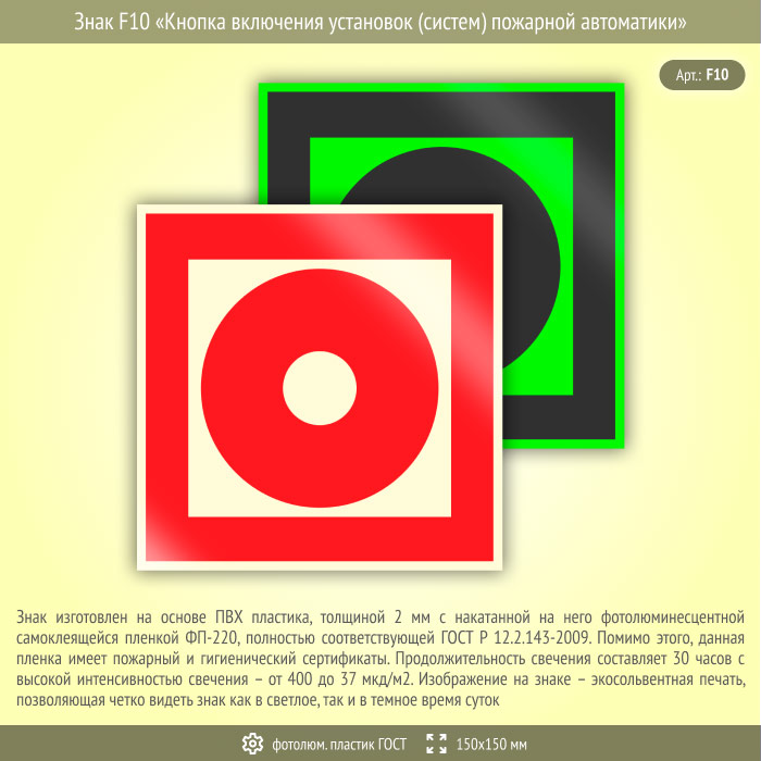 Знак F10 «Кнопка включения установок (систем) пожарной автоматики» (фотолюминесцентный пластик ГОСТ 34428-2018, 150х150 мм) в Твери купить