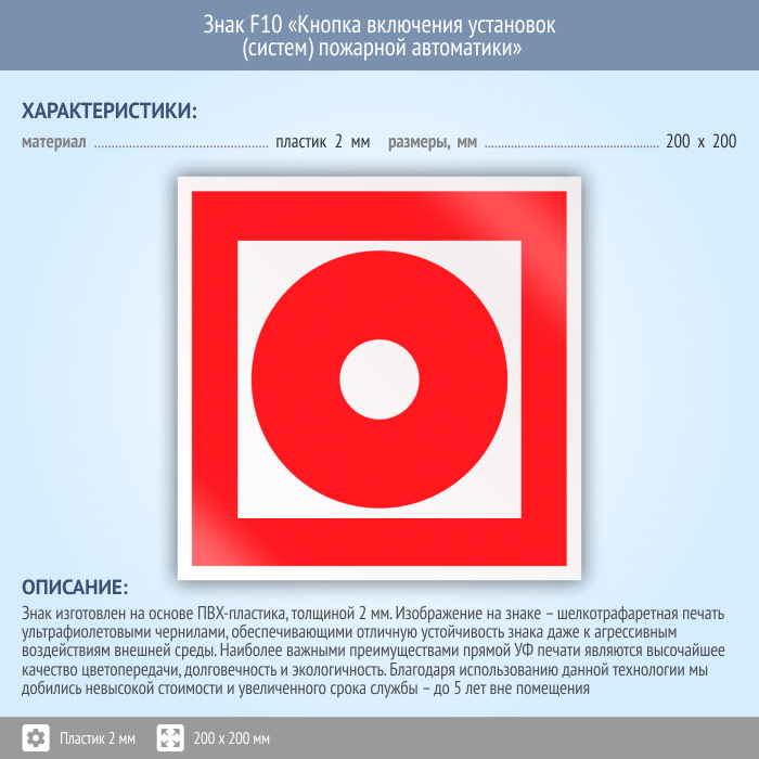 Знак F10 «Кнопка включения установок (систем) пожарной автоматики» (пластик, 200х200 мм) в Твери купить