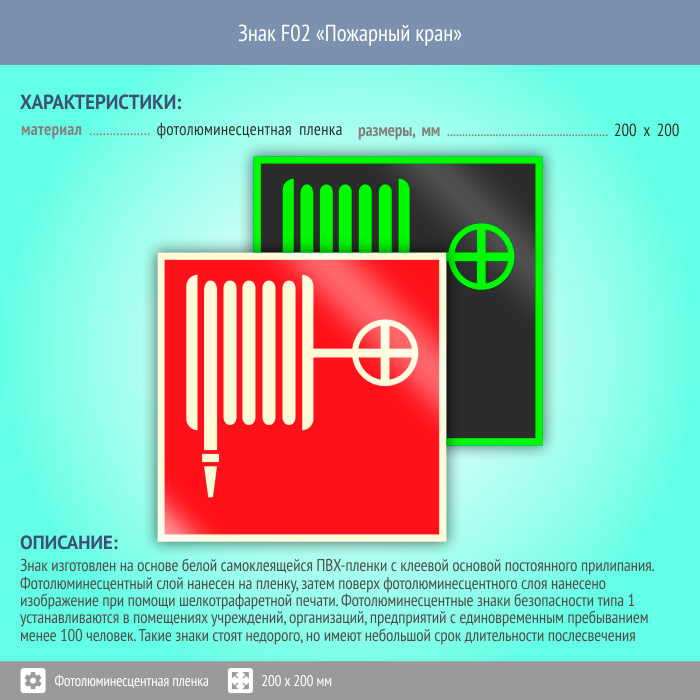 Знак F02 «Пожарный кран» (фотолюминесцентная пленка, 200х200 мм) в Твери купить