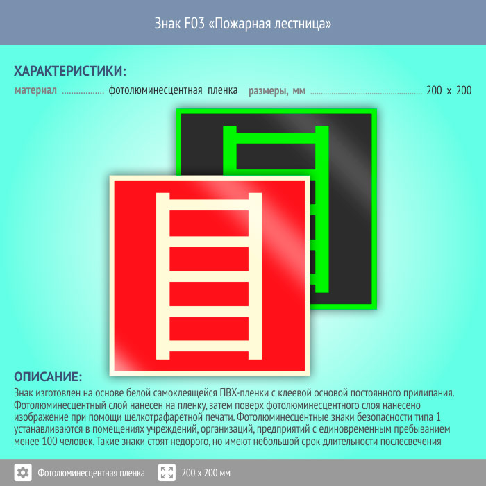 Знак F03 «Пожарная лестница» (фотолюминесцентная пленка, 200х200 мм) в Твери купить
