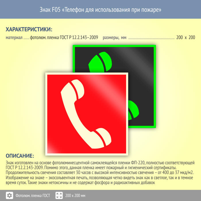 Знак F05 «Телефон для использования при пожаре (в том числе телефон прямой связи с пожарной охраной)» (фотолюминесцентная пленка ГОСТ 34428-2018, 200х200 мм) в Твери купить