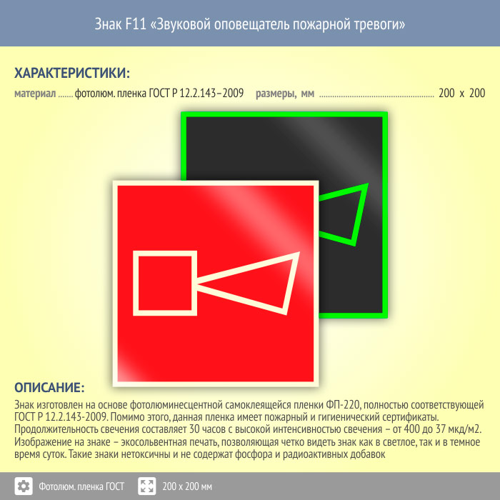 Знак F11 «Звуковой оповещатель пожарной тревоги» (фотолюминесцентная пленка ГОСТ 34428-2018, 200х200 мм) в Твери купить