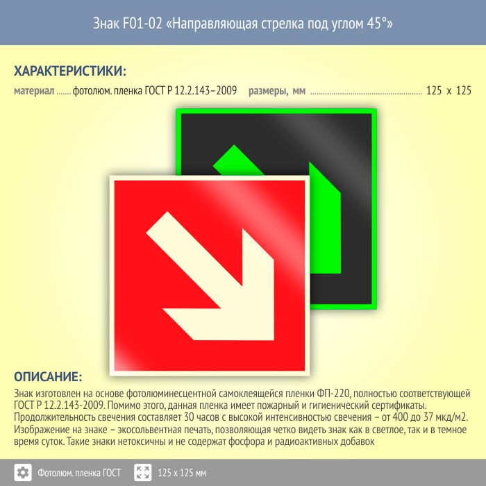 Знак F01-02 «Направляющая стрелка под углом 45°» (фотолюминесцентная пленка ГОСТ 34428-2018, 125х125 мм) в Твери купить