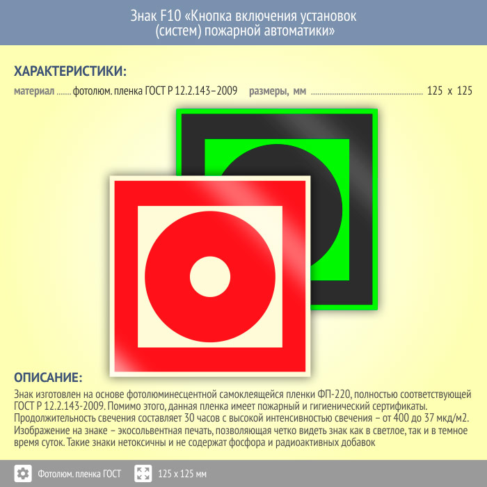 Знак F10 «Кнопка включения установок (систем) пожарной автоматики» (фотолюминесцентная пленка ГОСТ 34428-2018, 125х125 мм) в Твери купить