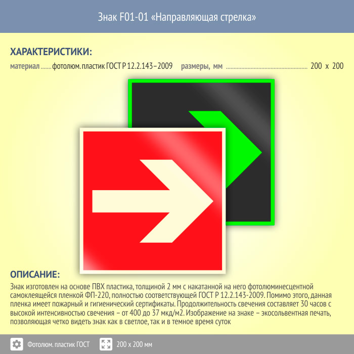 Знак F01-01 «Направляющая стрелка» (фотолюминесцентный пластик ГОСТ 34428-2018, 200х200 мм) в Твери купить