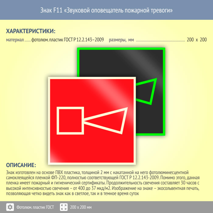 Знак F11 «Звуковой оповещатель пожарной тревоги» (фотолюминесцентный пластик ГОСТ 34428-2018, 200х200 мм) в Твери купить