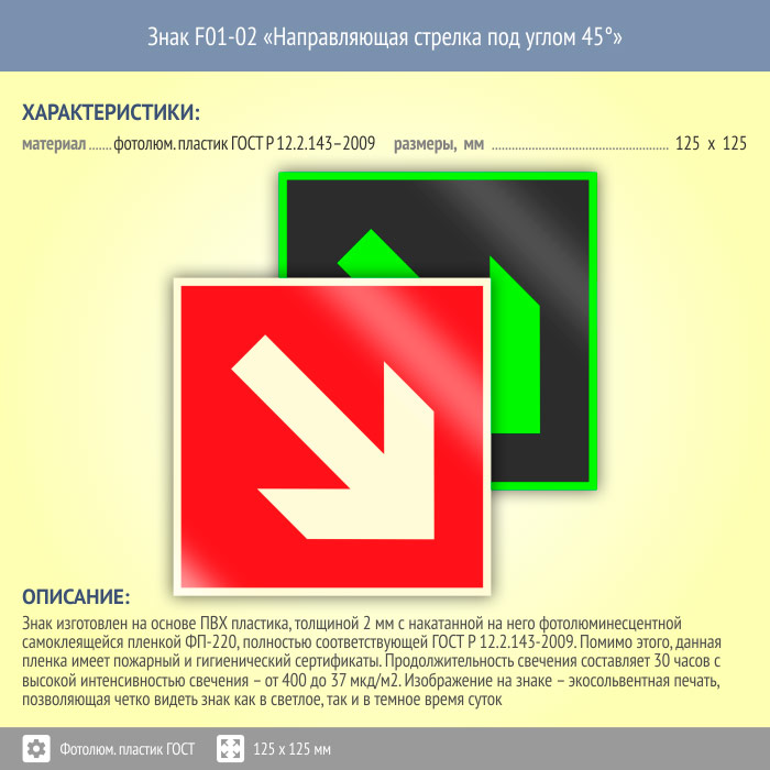 Знак F01-02 «Направляющая стрелка под углом 45°» (фотолюминесцентный пластик ГОСТ 34428-2018, 125х125 мм) в Твери купить