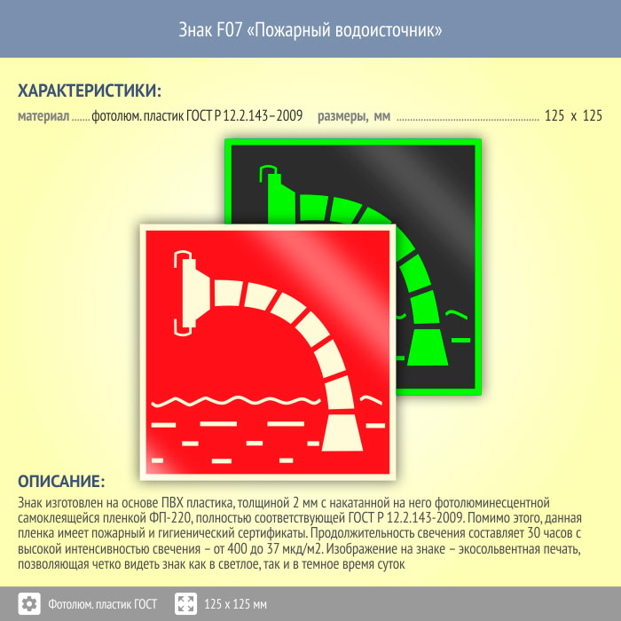 Знак F07 «Пожарный водоисточник» (фотолюминесцентный пластик ГОСТ 34428-2018, 125х125 мм) в Твери купить